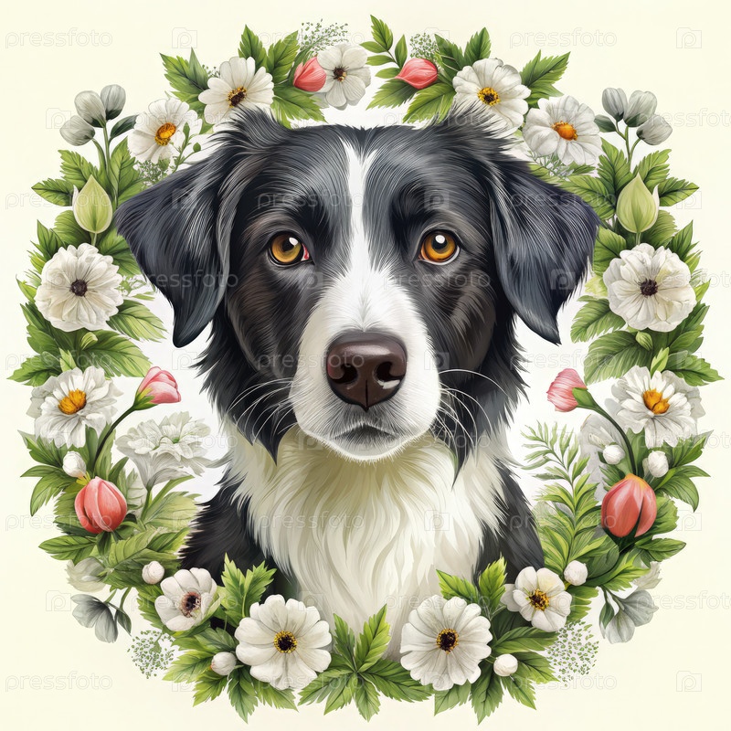 Черно-белый портрет собаки с белыми цветами