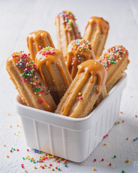 Карамельно покрытые чурро с рассыпаниями в белой керамической корзине