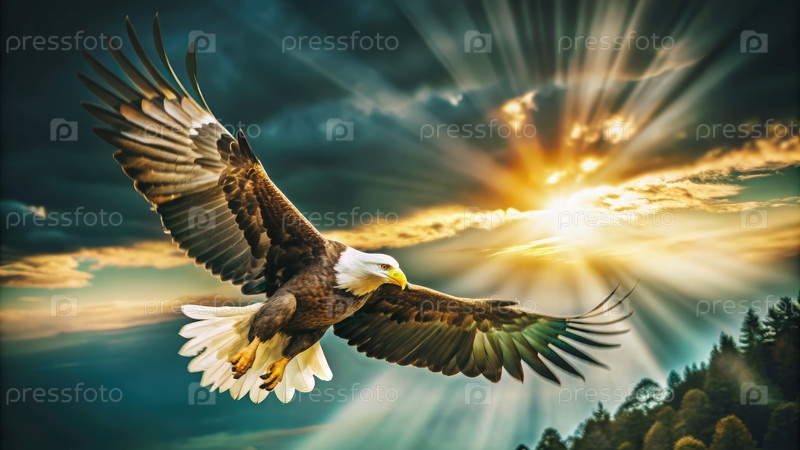 Величественный лысый орел, летящий сквозь солнечные облака