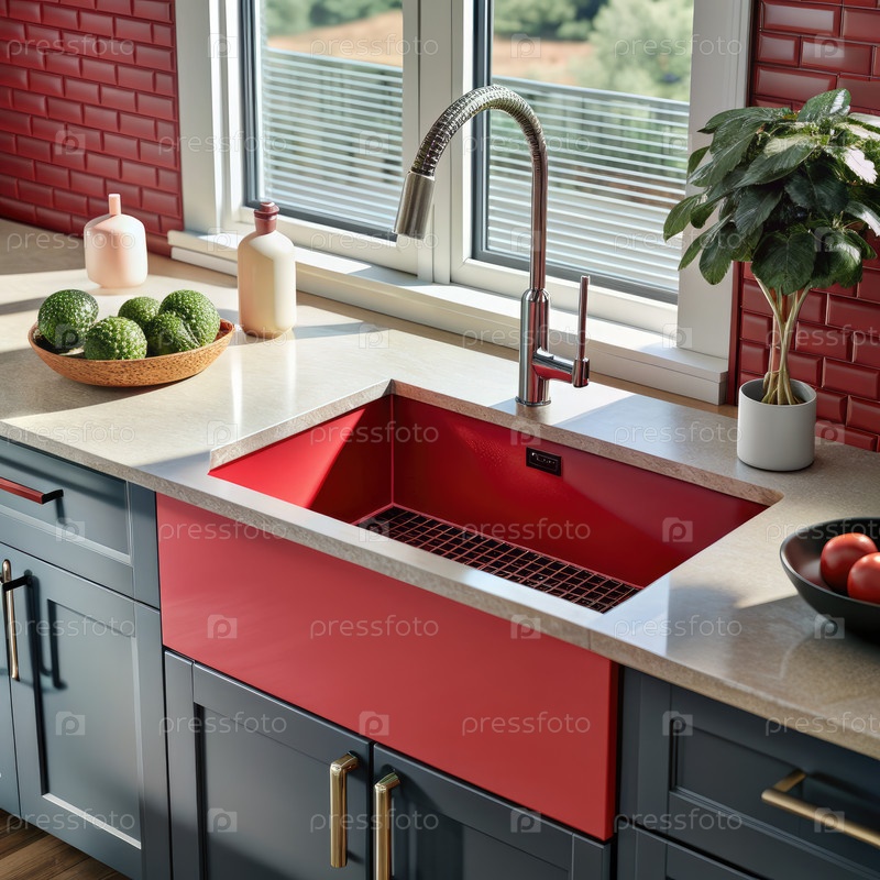 Кухонный раковина с красной ванной фермы и чистым никелевым краном. генеративная современная ИИ