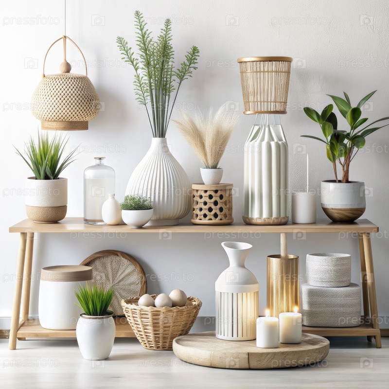 Дисплей домашнего декора с белыми вазами, растениями и деревянными акцентами