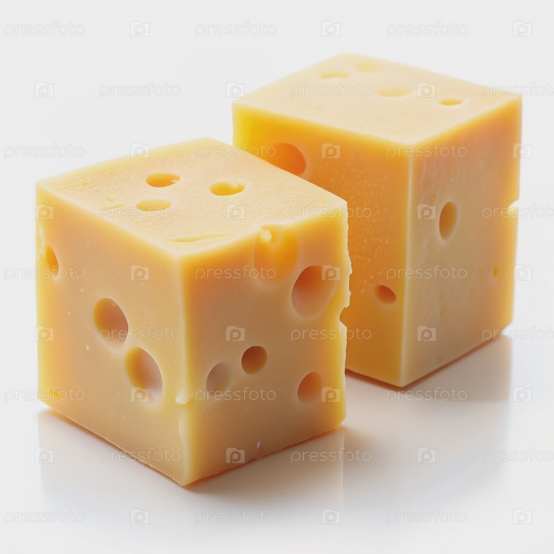 Два кубика швейцарского сыра на белой поверхности