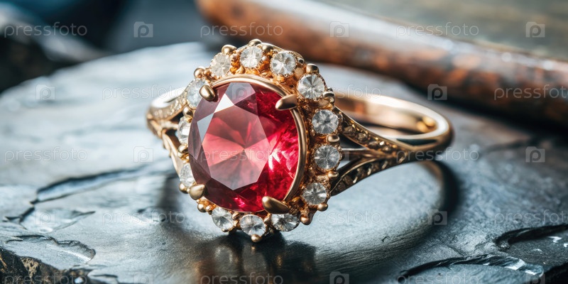 Ближайшее изображение золотого кольца с красным рубином и алмазными акцентами на черном камне