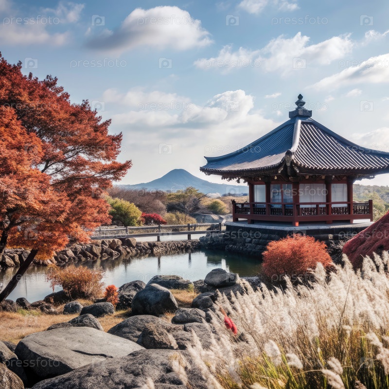 Осенние пейзажи в традиционном павильоне на острове Чеджу