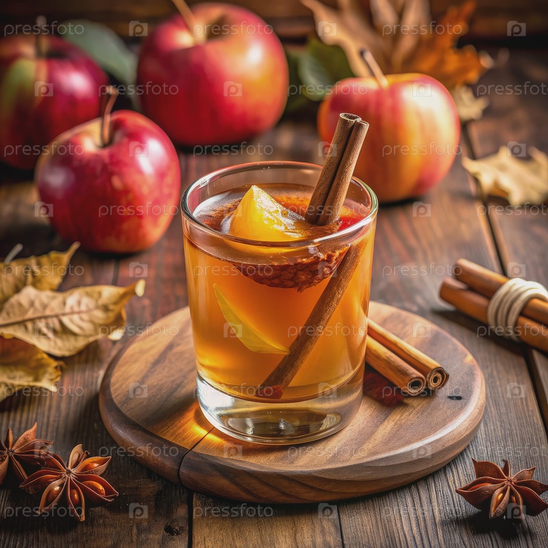 Пикантный яблочный сидр с палочками корицы и звездным анисом на деревянной столешнице