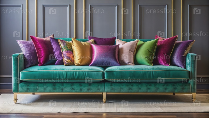 Вельветный диван с красочными подушками в современной гостиной. генеративная ИИ