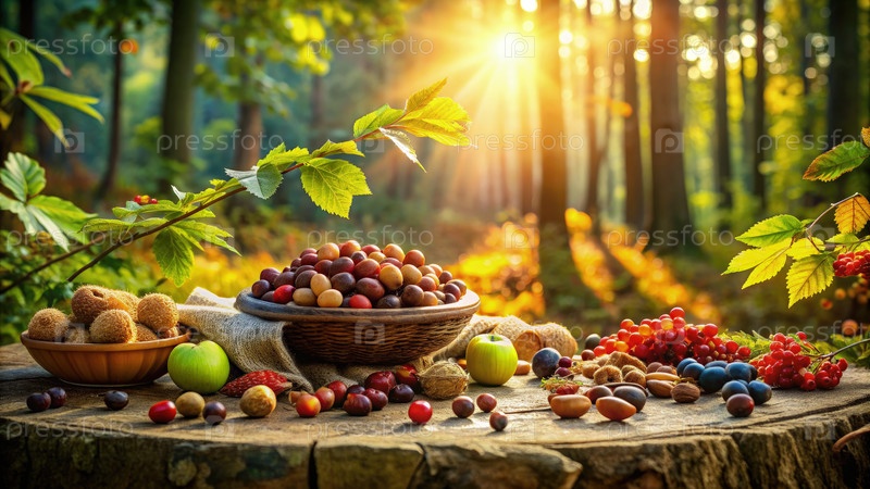 Осенняя лесная поляна с разнообразными фруктами и орехами. генератив AI
