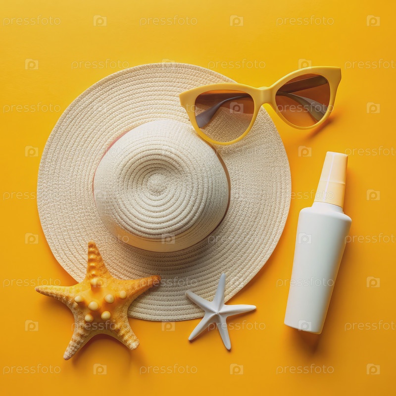 Плоская полоса летних предметов первой необходимости: соломенная шляпа, солнцезащитные очки, крем и ракушки на желтом фоне. генеративный ИИ