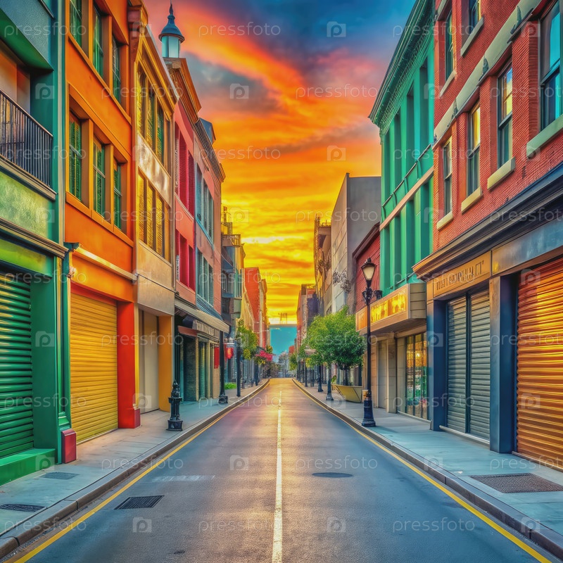 Красочные витрины на тихой улице при закате солнца