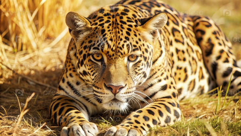 Ягуар прижимается к траве, наблюдая за добычей в золотой час