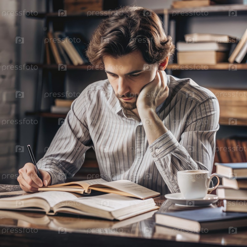 Молодой человек учится в библиотеке с чашечкой кофе и открытыми книгами