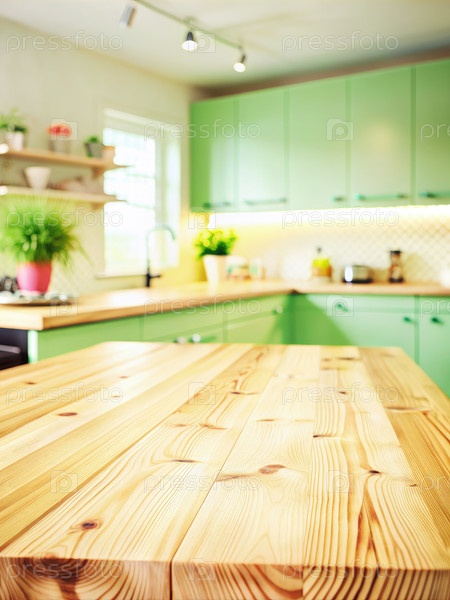 Близкий взгляд на легкую деревянную кухонную столовую с зеленой кухней в фоне. генеративный ИИ