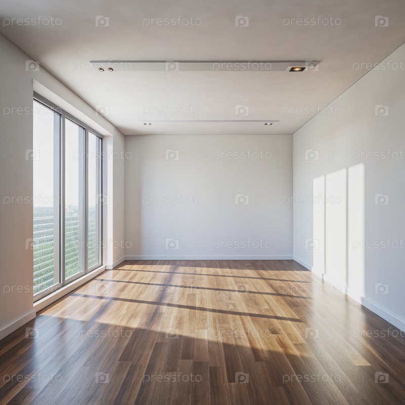 Минималистская пустая комната с деревянными полами и потоком солнечного света через окна