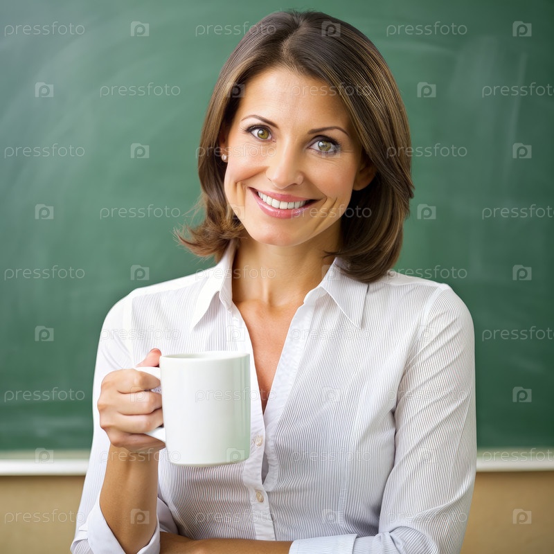 Улыбающаяся учительница держит кофейную кружку в классе