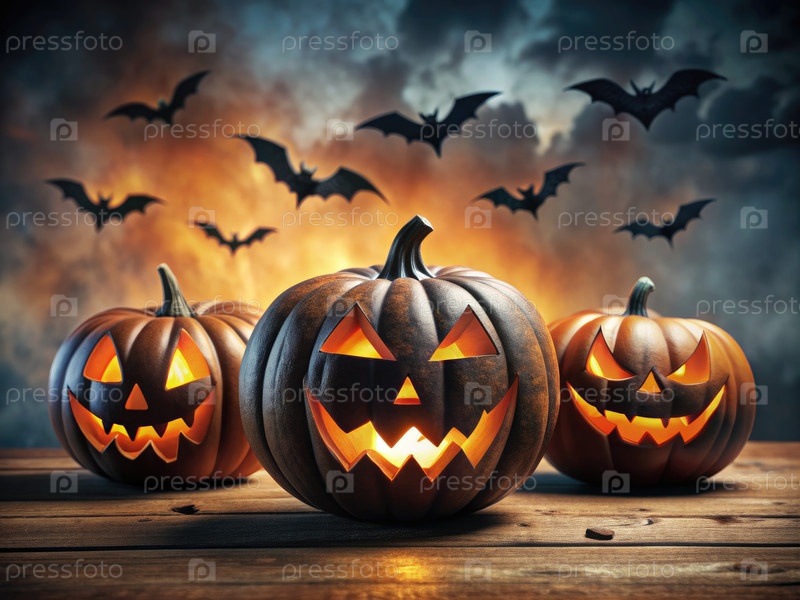 Светящиеся фонарики на деревянном столе с битами на заднем плане для Хэллоуина
