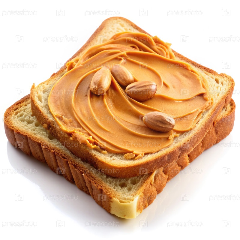 Арахисовое масло и поджаренный хлеб с кусочками арахиса на белом фоне. Генеративный ИИ