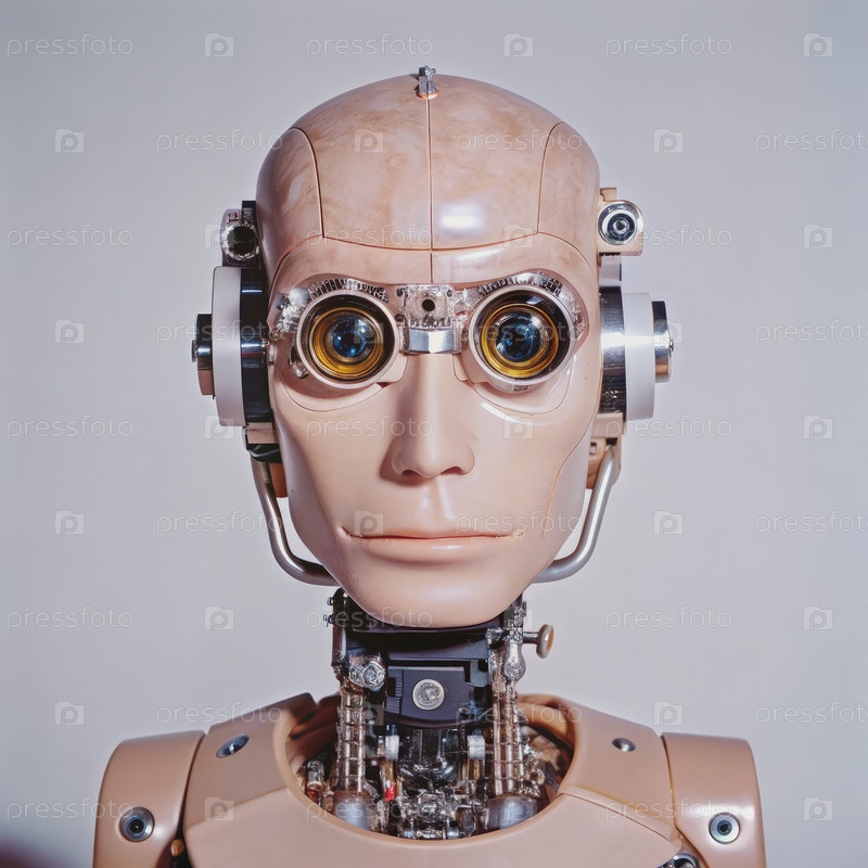 Близкий взгляд на гуманоидную голов робота с механическими глазами. генеративный ИИ