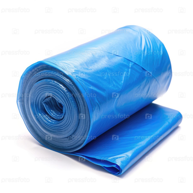 Свернутый синий пластиковый мусорный мешок на белом фоне