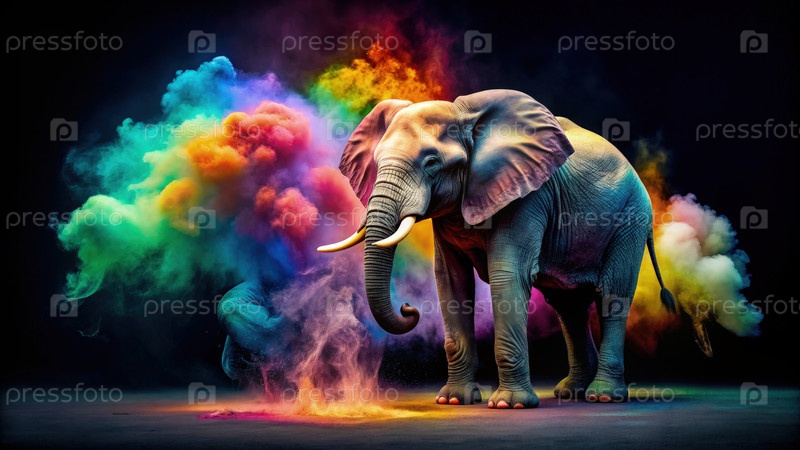 Красочный слон, стоящий в облаке цветного дыма