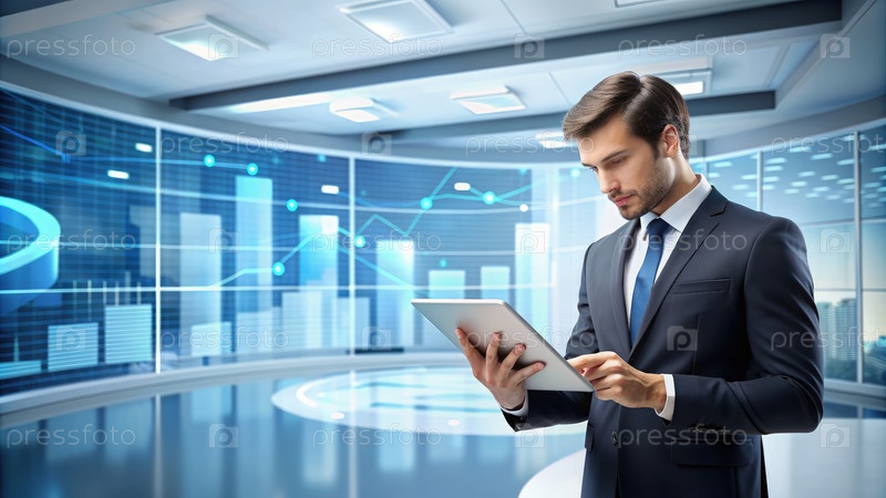 Бизнес-аналитик, изучающий данные на планшетах в современном офисе