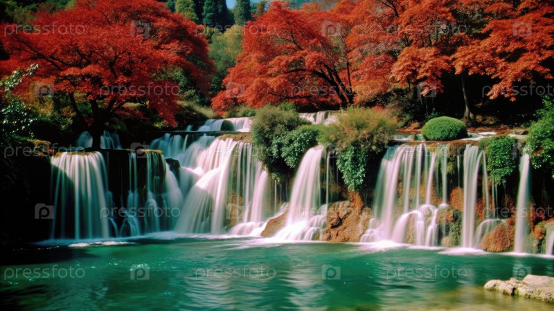Спокойный водопад каскадирует сквозь пышные осенние листья