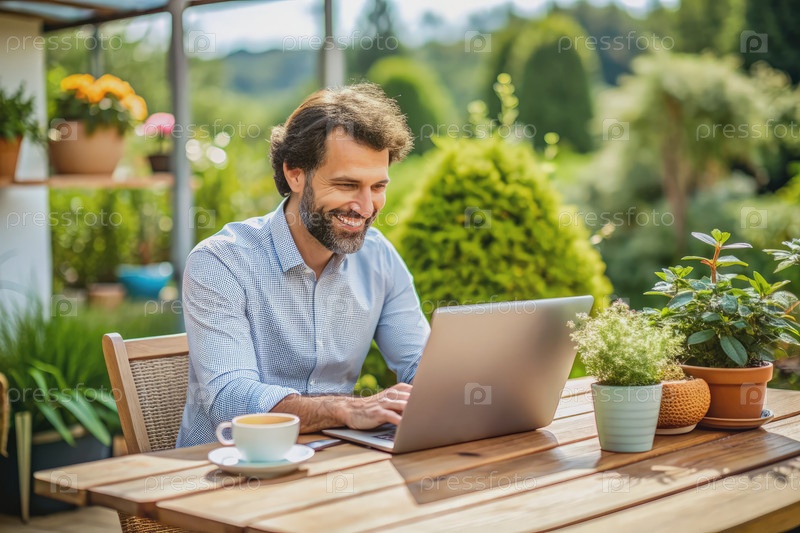 Человек работает на ноутбуке, наслаждаясь кофе на террасе