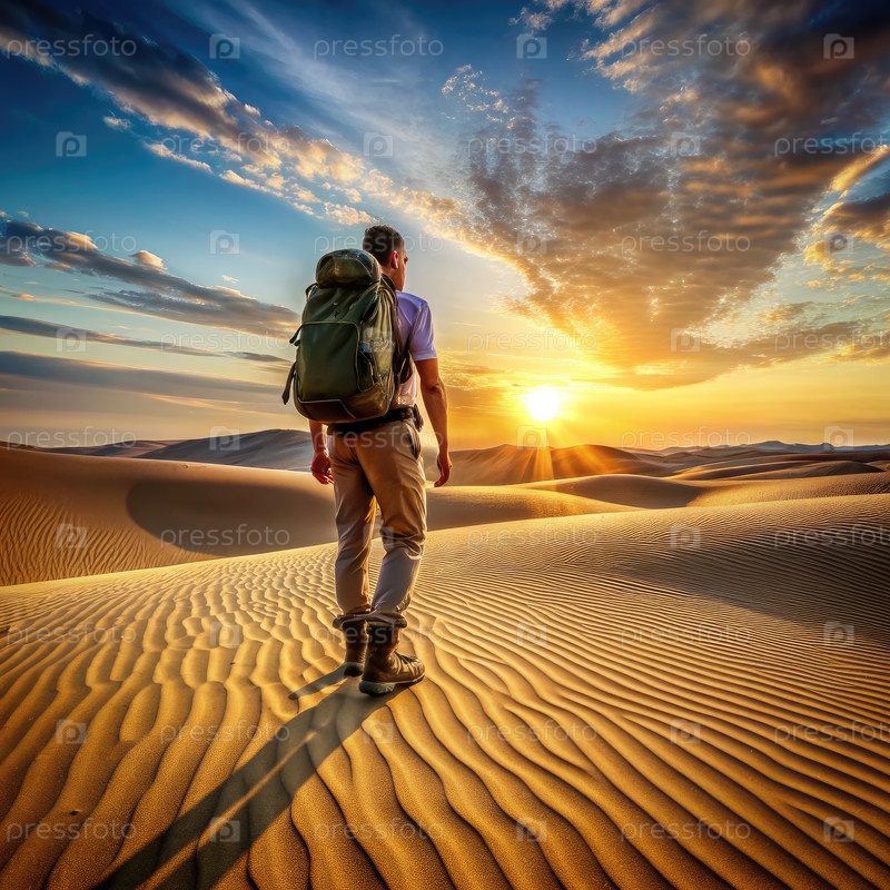 Рыбак ходит по песчаным дюнам на закате в пустыне