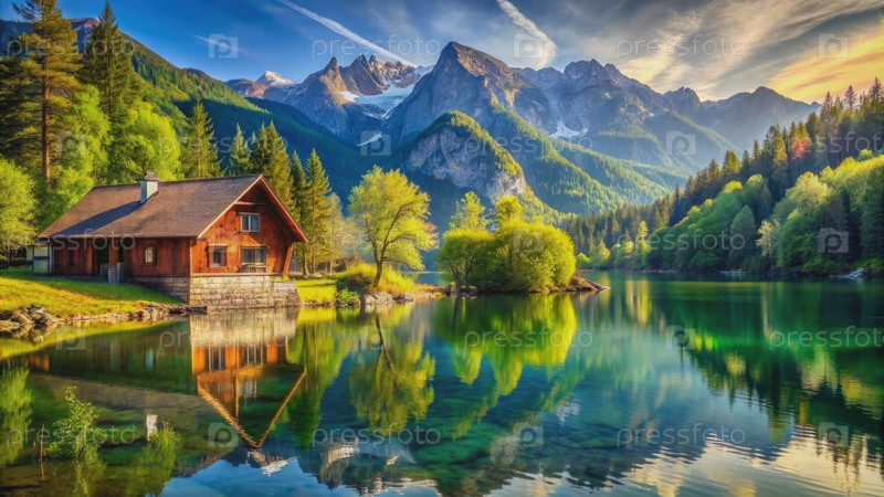 Живописный домик в горном озере с потрясающим видом на восход солнца