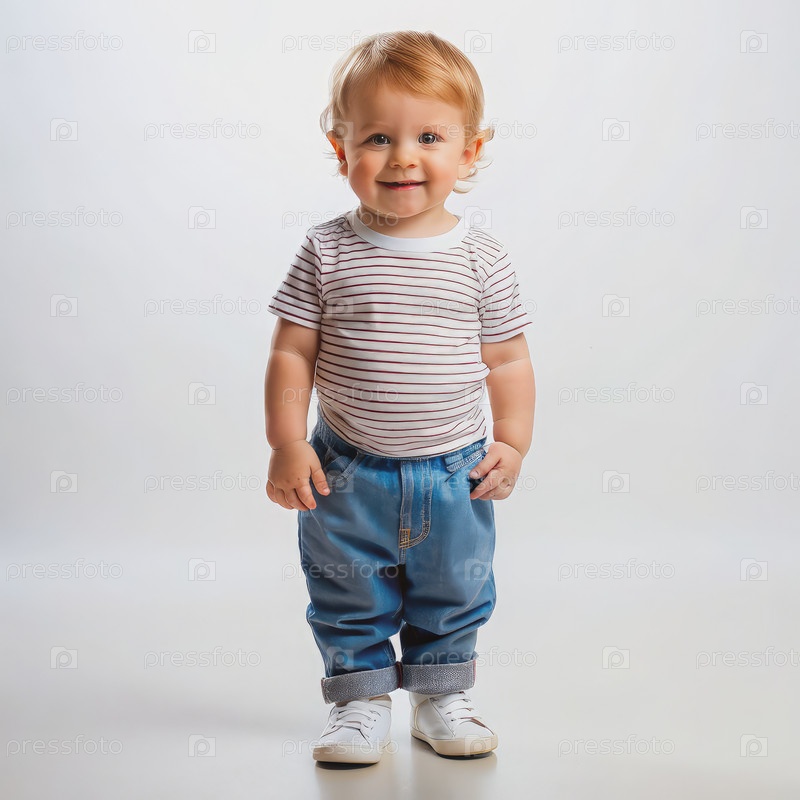 Улыбающийся малыш в полосатой рубашке и джинсах стоит на белом фоне