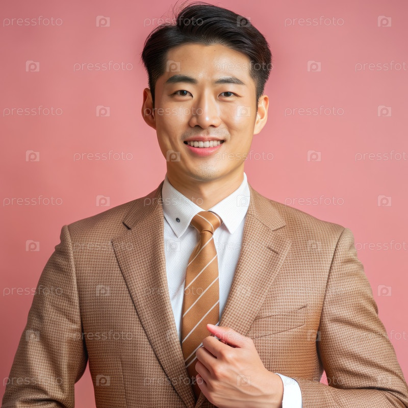 Уверенный азиатский бизнесмен в коричневом костюме корректирует галстук на розовом фоне