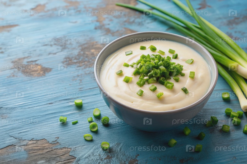 Кремный белый соус с зелеными луками на синем столе