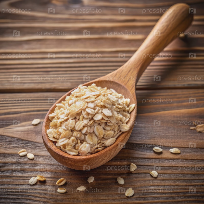 Деревянная ложка, заполненная овсяной кашей на деревянной поверхности. генеративный ИИ