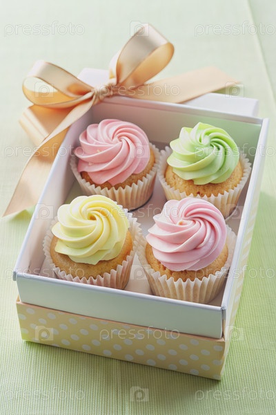 Четыре вихревые кексы в подарочной коробке с золотой ленточкой
