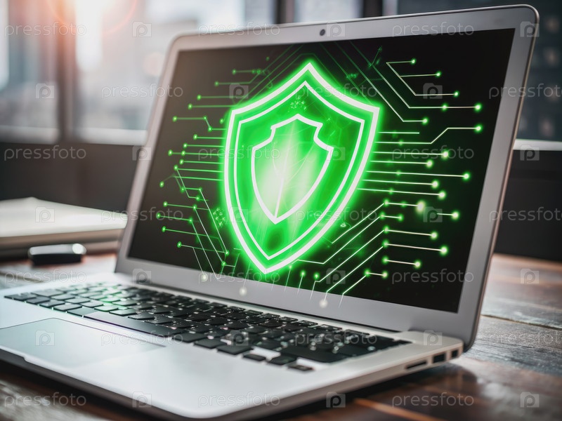 Зеленый щит кибербезопасности отображается на экране ноутбука