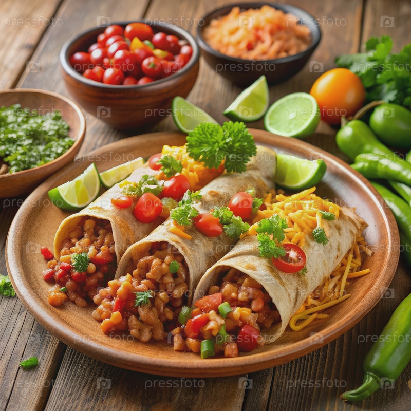 Три вкусных мексиканских энчилады с помидором, сыром и кориандровыми гарнитурами