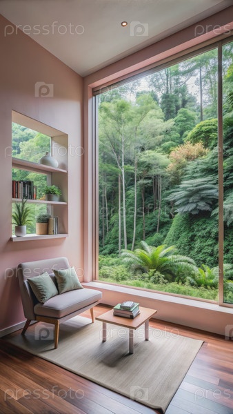 Уголок чтения с видом на лес и серым полом. генеративный современный ИИ