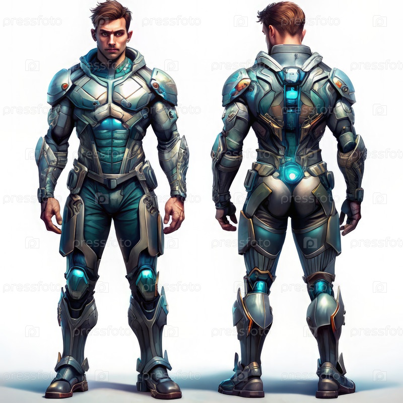Футуристическое концептуальное искусство мужского персонажа: передние и задние виды в передовой броне. генеративный ИИ