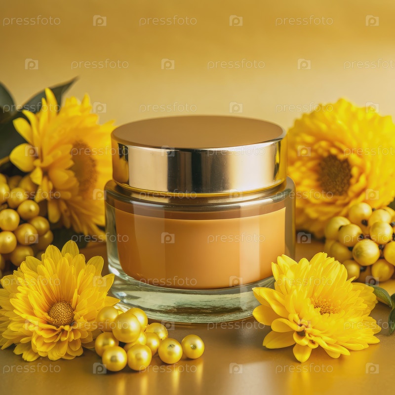 Стеклянная банка с желтым кремом, окруженная желтыми цветами и золотыми бусинами