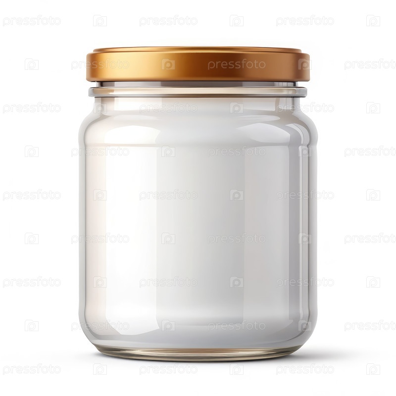 Стеклянная банка с золотой крышкой на белом фоне
