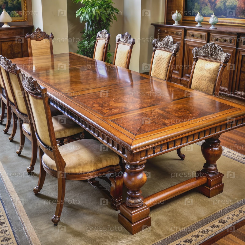 Большой деревянный обеденный стол установлен в элегантном домашнем интерьере