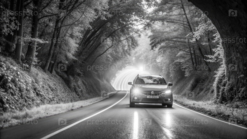 Черно-белая фотография автомобиля, движущегося с высокой скоростью по извилистой лесной дороге