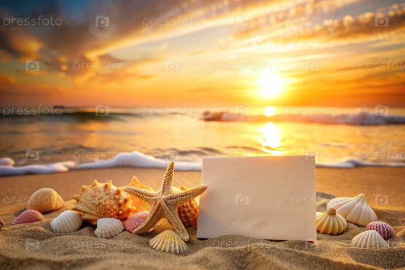 Пустой макет свадебного приглашения на песчаном пляже в закате
