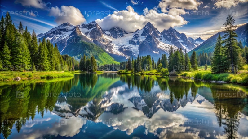 Спокойное горное озеро, отражающее снежные вершины в солнечный день