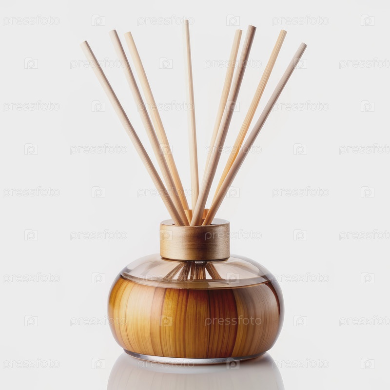 Деревянный диффузер из тростника с круглой стеклянной бутылкой и золотой вершиной. генеративная AI