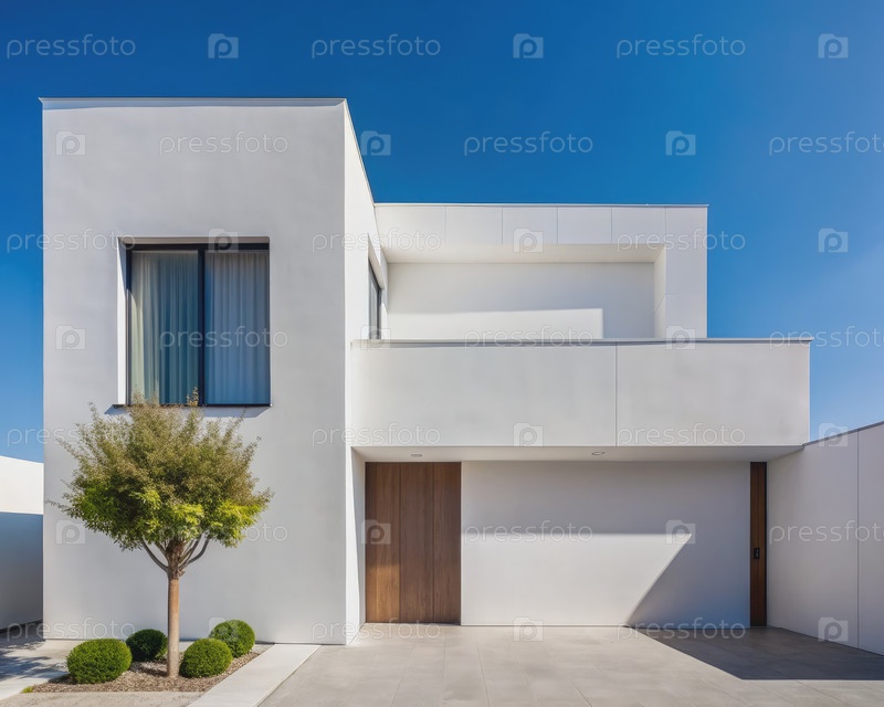 Минималистский белый фасад с одним деревом и деревянной дверью