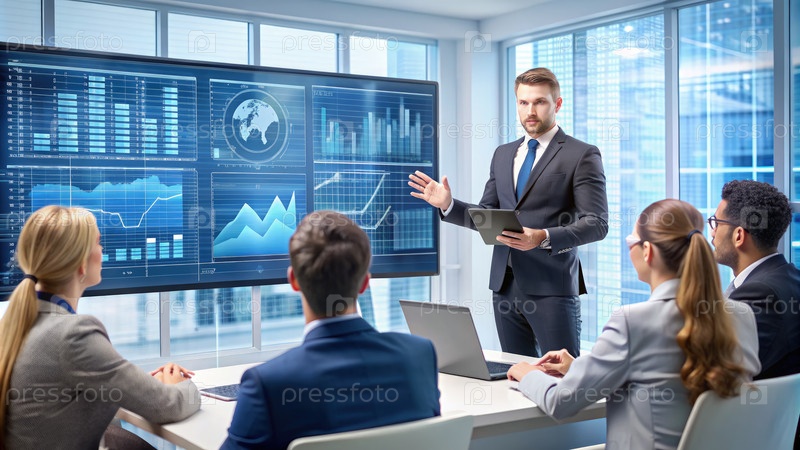 Финансовый планировщик представляет аналитические данные клиентам во время деловой встречи