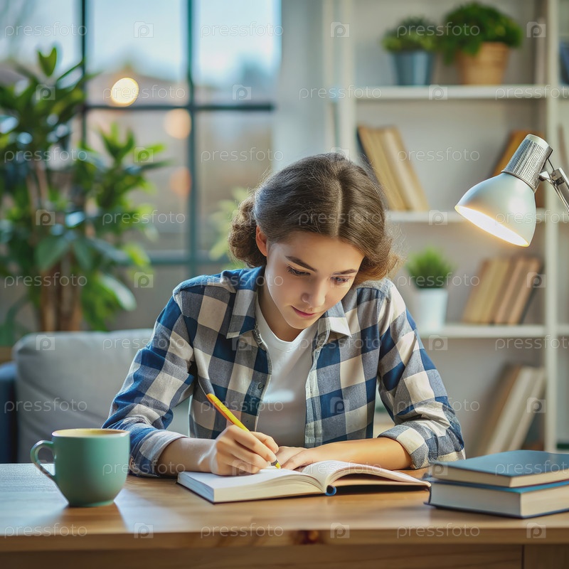 Молодая женщина пишет в блокноте на столе в домашнем офисе