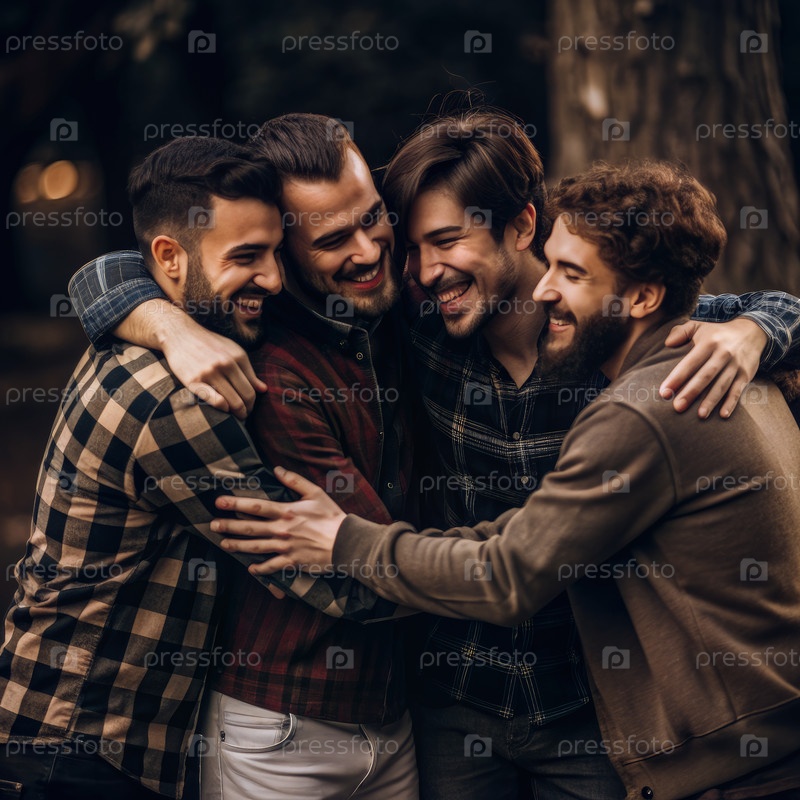 Группа друзей, обнимающихся в лесу в солнечный день