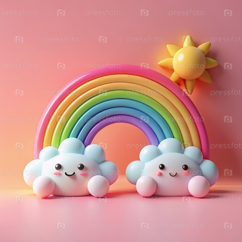 Пастельная радуга с улыбающимися облаками и солнечным небом