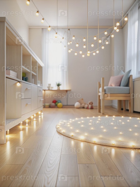 Близкий взгляд на пол, заполненный светом игровой комнаты с белым ковром